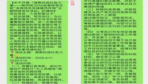 为了学习贯彻习近平总书记重要讲话精神,学习抗疫中涌现出的先进事迹,太阳成2018级普研党支部于3月10日至20日组织开展了“凝聚抗疫红色力量,发挥党员先锋模范作用”一系列主题网络党日活动。