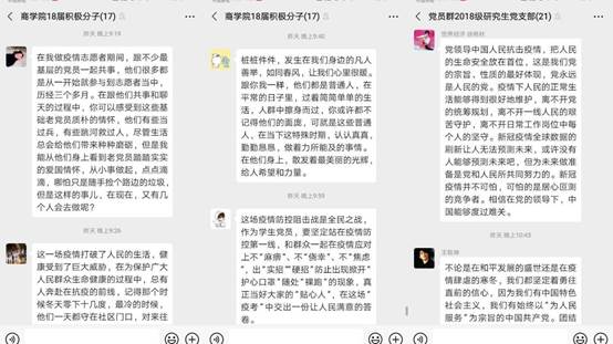 接下来,各与会成员纷纷就“中国共产党成立99周年”发表自己的感悟。富梦妍同学通过列举自己身边长辈的无私奉献精神,表达了对老一辈质朴的爱党爱国情怀的尊重。刘林同学同样结合自身见闻,号召大家向长辈们学习,在今后的生活中发扬奉献精神。除此之外,各成员也纷纷在线上群内就自身感悟发表看法。
