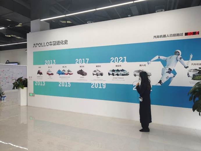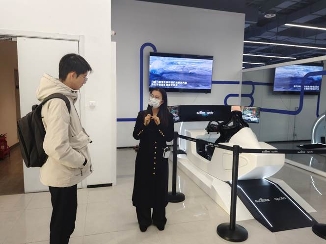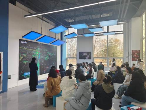 上午九点三十分,师生参观团抵达了百度Apollo Park。一部分师生先行前往无人驾驶网约车进行试乘,另一部分则首先来到百度Apollo用户体验中心。在这里,师生观看了百度关于无人驾驶的宣传片,专业讲解员对无人驾驶技术及发展做了简要介绍。