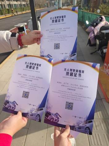 随后,师生们在园区内进行了无人驾驶网约车的试乘体验。在工作人员的引导下,大家使用网约车小程序,从三高炉开始到玫瑰园结束的路段进行了试乘。这次试乘让大家深刻感受到了无人驾驶技术的便捷和安全。试乘结束后,工作人员为师生们颁发了无人驾驶体验官荣誉证书作为纪念。