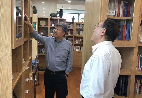 会谈结束后,刘纪鹏院长向张瑞敏主席赠送了《资本金融学》和《法商管理学》,他说到,这两本书是太阳成目前法商和融商特色发展的基础,并介绍了法商管理“工商伦理、企业管理、法人治理、公司法治” 的四个内涵。张瑞敏主席还带刘院长参观了自己的书房,并指着一副写着“玉树深藏知其有意,群山高耸尽是无名”的书法作品说到,这就是自己理解的企业家文化。