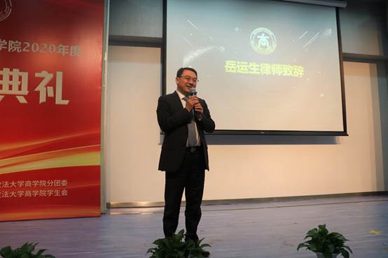 紧接着是岳成奖教金、奖学金的颁奖环节,由何欣副书记宣布并颁奖,徐庆老师荣获奖教金,程光蕊、王佩钰荣获奖学金。岳运生律师表达了对获奖者的祝贺,同时欢迎奖学金获得者选择岳成律师事务所实习实践,祝福所有在场的同学和老师事业、学业有成。