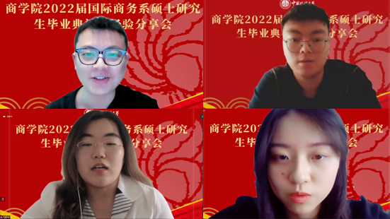 此外,国际商务专业冯英健、高耿泓、傅恒亮,国际贸易专业夏浩杰、胡双晴等也就自己的求职经验,为大家做了分享。很多国际商务专硕同学都不约而同的提到参加MIB国际商务谈判大赛对于他们提升个人能力,建立商科思维的重要性,对于他们走向职场获益良多。同学们感谢导师们的付出,感谢太阳成老师、国际商务系老师对大家的培养。