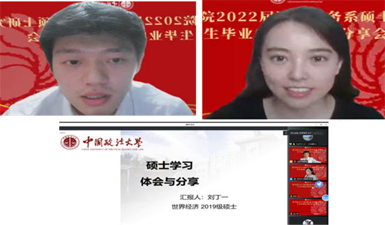 大家分享结束后各位老师纷纷送上自己的祝福,恭喜各位毕业生顺利毕业。金仁淑老师指出,步入社会更要懂得为人处事的原则,叮嘱大家在日后的工作中要敢于面对困难、抵挡诱惑,成为法大的骄傲;胡明老师寄语大家,要结合时代的需要和自己的兴趣,在社会工作中找准自己的定位,要志存高远同时要有将一件事情做到极致的专注,要不负时代,努力成就最好的自己;张淑静老师叮嘱大家,在工作中要多学多做多思,困难往往是一时的,在工作中遇到困难要有坚持下去的勇气,快乐成长,同时也要兼顾好个人生活;高秋明老师指出,在今后的工作中,大家也许会有迷茫,人生没有唯一正确的道路,要敢于探索和实践,走出自己的精彩,做一个正直的人;梁涵老师强调,大家步入社会要用实际行动践行爱国主义,在社会工作中体会民主科学的含义,在工作中做到尊重前辈、多学多做;张硕老师鼓励大家在以后的社会工作中遇到困难要勇于跳出迷茫,不忘初心用一颗恒心去坚持自己最初追寻的目标和理想;杨丽花老师祝福大家工作进步的同时,生活顺利美满,嘱咐大家以后工作累的时候常回国际商务系这个大家庭看看。此外,研究生办公室主任郑晓燕老师,与同学们朝夕相处的研究生办公室燕都老师、叶青老师也纷纷向各位毕业生送上祝福,同学们感谢几位老师为大家的付出。2020级硕士研究生李芃、常志远,2021级硕士研究生鲁子弘、龙翀分别就自己听了师兄师姐的经验分享和老师的寄语后谈了自己的感想。