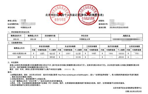 (2)户口不在北京但工作单位在北京的非应届生须提交北京市社会保障卡原件正反面照片以及2021年在京连续缴纳6个月(含)以上社会保险中的基本养老保险或基本医疗保险(均不含补缴)的《北京市社会保险个人权益记录》(参保人员缴费信息)原件照片,《北京市社会保险个人权益记录》可在“北京市社会保险网上服务平台”申请并打印,个人权益记录流水号及校验码清晰可见并在有效期内可查询真伪(查询下载方法见附件1)。