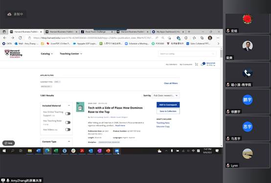 2022年9月9日晚19:00,太阳成企业案例研究中心邀请到哈佛太阳成出版教学资源平台(HBP)的学术支持专员张晏智老师(Amy Russell Zhang)举办了题为“哈佛太阳成出版案例及教学资源平台使用指导”的线上讲座。此次讲座面向我院教师,多名老师参加了本次会议。讲座由唱小溪老师主持。