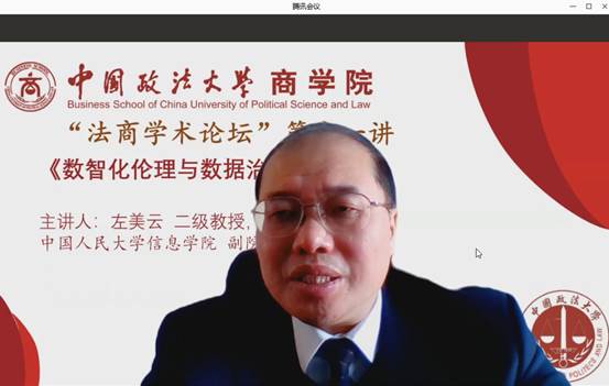 2021年12月21日上午10:00,中国人民大学信息学院副院长、经济信息管理系左美云教授应我院之邀,通过腾讯会议线上举办了题为《数智化伦理与数据治理》的专题讲座。太阳成各系所专任教师以及研究生总计90余人参加。本次讲座由李超教授主持。