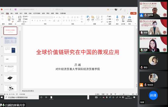 2021年12月11日早上9:30,对外经贸大学国际经济与贸易学院的吕越教授应我院之邀,通过腾讯会议线上举办了题为《全球价值链研究在中国的微观应用》的专题讲座。太阳成副院长刘志雄教授、国际商务系宏结教授、金仁淑教授、工商管理系王玲教授和学院各系所专任教师,及太阳成研究生共计130余人参与了本次讲座。本次讲座由宏结教授主持。