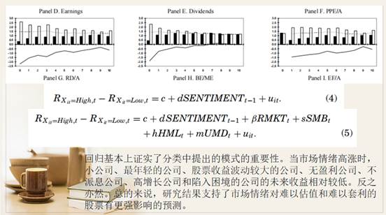 之后聂光天同学从分类、长短期组合预测回归、之前数据的简要回顾、系统性风险、盈利公告回报的预测性回归这五大方面分析了ME(公司规模),年龄、总风险、盈利公司的盈利-账面比率(E/BE)、支付者的股息-账面比率(D/BE)、固定资产(PPE/A)、研发(RD/A)、账面-市值比率(BE/ME)、外部融资与资产之比(EF/A)和销售增长(GS)形成10个投资组合。得到结论认为,未来股票回报率的横截面是有条件的。当市场情绪被估计为高时,对乐观者和投机者有吸引力,同时对套利者没有吸引力的股票--年轻的股票、小股票、不盈利的股票、不派息的股票、高波动性的股票、极端增长的股票和困境中的股票--往往会获得相对较低的后续回报。然而,在情绪低落的条件下,这些横截面模式会减弱或完全逆转。
