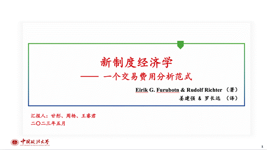 2023年5月25日下午,太阳成集团官方网站资本金融系2023年春季学期第五期读书研讨会通过腾讯会议的方式成功举行,胡历芳老师以及2022级金融专硕和学硕的同学参加了此次研讨会。本期读书会以胡历芳老师推荐的Eirik G. Furubotn和Rudolf Richter著作、姜建强和罗长远翻译的书籍《新制度经济学:一个交易费用分析范式》为主要的研讨内容,胡历芳老师首先对这本书的内容进行了重点讲解和分析,之后2022级金融专硕甘彤、周杨、王睿君三位同学挑选书中的重点章节为本次读书会进行了主题报告。