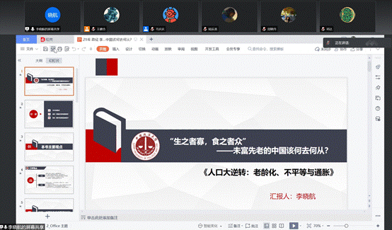 在讨论发言环节,毛庆庆同学认为当前应对人口老龄化有两大优势:一是人类技术积累更充足,技术革命方兴未艾;二是恰恰因为老龄化更严重,劳动人口和老年人口的相对价格变化更明显,更能引导市场资源进行相应配置和调整。贾丽璇同学先是介绍我国以居家养老为主的现状,然后对比了各国的养老方式,认为我国应大力发展养老产业。赵宇萱同学认为延迟退休不一定是应对人口老龄化的药方,因为延迟退休可能造成劳动力结构不匹配,对青年劳动力就业造成顺位挤压,可能不利于产业结构升级。王善迪同学介绍有研究指出人工智能会对劳动力就业产生异质影响,自动化会使得高科技人才需求更旺盛,而流水线岗位会被替代,反而扩大了收入差距。杜函辉同学认为本书的观点即人口结构对通胀有决定性影响很新颖,但与货币主义学派和凯恩斯主义学派关于通货膨胀理论的主流观点不一致,还认为新冠疫情期间是由于供给侧成本上升而不是人口结构所导致的通货膨胀。张群同学也强调市场的自发调节作用。虽然老龄化不可逆转,但其实许多企业家早就针对老年抚育需求做了技术探索,比如养老机器人,因而不必过分担忧。欧文潇同学首先分享了书中的核心观点,然后谈了自己的看法:受新冠肺炎疫情的影响,民营企业,尤其是中小企业面临很大的生存压力,对此,我国政府在疫情爆发后迅速出台多种政策(财政政策和货币政策)支持企业应对冲击。孙海若同学认为虽然青年劳动力数量和增速意义上的人口红利消失,但可以发掘“第二次人口红利”即提高劳动力素质,充分挖掘劳动力的人力资本存量。李丹同学提到面临人口老龄化问题,我国目前提出采取每5年把退休年龄延长1岁的阶梯式、渐进式的制度设计,从而提高老年劳动参与率,但这种制度设计还可以进一步改善,根据不同行业、不同类型的工作设定不同的弹性退休年龄,从而避免“一刀切”,使制度更具人性化。谭先杰同学认为人工智能等技术的进步,一方面能提高劳动生产率和总产出,但另一方面,也会导致收入不平等。另外,在讨论如何应对老龄化的同时,也要注意到少子化也是一个不容小觑的问题,仅仅放开二胎、三胎政策是不够的,还需要在教育、医疗、住房等方面提供配套支持措施,以应对生育率和人口净增量不断下降的问题。王健合同学认为养老产业的发展不一定没办法满足养老需求。同时还指出由于我国文化背景和西方国家不同,更重视亲情关系,因此发展养老产业应有我国特色。王禹婷同学认为当前世界陷入人口老龄化的僵局,中国提出了“二孩”甚至“三孩”政策,但短时间内人口的变化趋势是不可逆转的,我们仍然需要在解决长期人口问题的基础上,考虑当前所面临的问题。