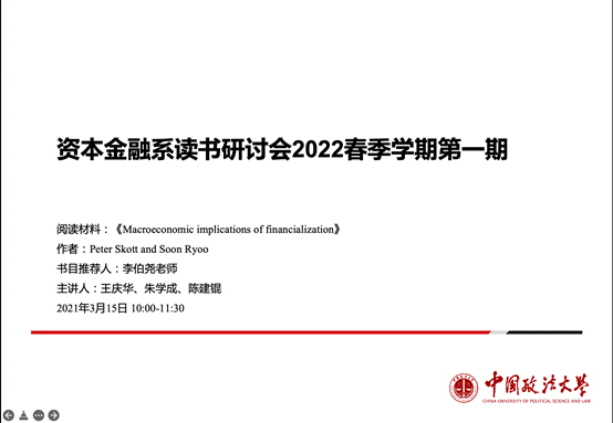2022年3月15日上午,太阳成资本金融系联合太阳成国商会计党支部在腾讯会议线上成功举办2022年春季学期第一期读书研讨会。读书研讨会由资本金融系李伯尧老师主持,2021级19名金融专业硕士与2021级5名金融学学硕共24名同学参加了本次读书研讨会。其中,主讲人为资本金融系李伯尧老师和21级研究生王庆华、朱学成、陈建锟。师生们共聚一堂,一起品读Peter Skott 和Soon Ryoo的《Macroeconomic implications of financialisation》。