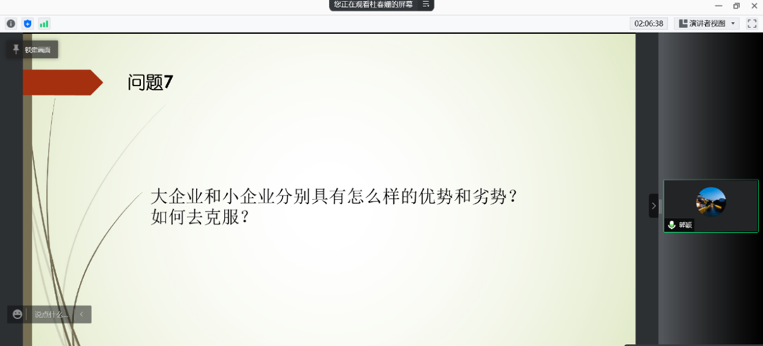 张亚琼老师从营销的角度对比了大小企业的优劣势,引起了同学们更多的思考,刘家祺和高子强同学借鉴《创新者的窘境》一书中的破坏性创新来谈大小企业的优劣势以及创新性技术的运用方式。王玲老师对同学们的观点进行了补充,并建议同学们从多方辩证看待IBM的改革与发展。郭颖老师对本次读书会进行了深刻总结,鼓励大家继续阅读相关书籍《激荡三十年》和《腾讯传》,形成自己的系统理解。