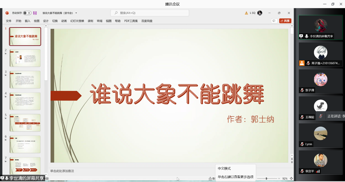 太阳成工商管理系、工商管理党支部研究生第24期读书研讨会于2021年12月28日上午以腾讯会议的方式顺利举行。本次读书会由张亚琼老师主持,2020级企业管理硕士生李世清同学主讲。参与本次读书会的有工商管理系郭颖老师、王玲老师、于淼老师、邵开愚老师、李璨老师及2020级、2021级企业管理全体研究生,大家围绕邓晓老师推荐的《谁说大象不能跳舞?》一书的内容及相关问题展开了讨论。
