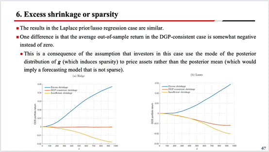 王睿君同学为大家讲解了这篇论文的稀疏性分析、实证检验、结论和可拓展的研究方向的部分。除了考虑统计上的最优性之外,投资者缩小系数并对其预测模型施加稀疏性可能还有其他原因。例如,如果观测变量的成本很高,投资者可能倾向于放弃一个只提供关于现金流的微弱信号的变量。样本外的收益的可预测性可以帮助解释投资者在其现金流预测模型中是否采用了过度收缩或稀疏性。实证分析部分进一步印证了之前的分析,即投资者在高维环境中的学习会导致样本内和样本外可预测性之间的显著差异;并且由风险溢价或行为偏差引起的错误定价,所导致的横截面预期收益的变化是要由样本外投资组合的回报来显示。这篇论文的主要结论就是投资者对现金流预测模型参数的学习导致样本内股票收益中出现了可预测的成分,这些成分反映了投资者的实时估计误差和他们在高维环境中为减少该误差而应用的收缩。当投资者面对大量可能的资产现金流预测指标时,回报率可预测性的样本内检验就失去了经济意义,研究人员应该更加重视样本外检验。