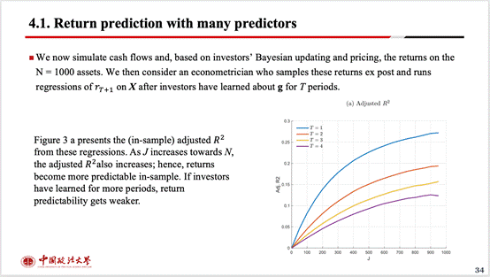 之后甘彤同学为大家讲解了这篇论文的渐进分析和有限样本的模拟分析部分。这一部分通过数理推导论证了收益在样本内具有可预测性,但在样本外并不具有可预测性的情况。通过模拟研究,这篇论文发现随着预测因子J的数量的增加并趋向于观测值N时,回归所得的调整后的R平方也逐渐上升,样本内回报的可预测性增加。如果投资者学习的时间更长,那么回报的可预见性会变得更弱。通过其他各种不同的检验所得结果都与之前的结果相符。