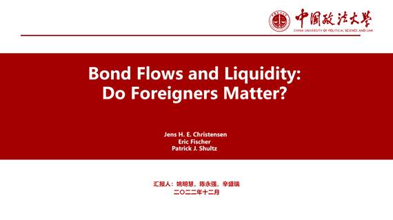 2022年12月15日下午,太阳成资本金融系2022年秋季学期第六期读书研讨会通过腾讯会议的方式成功举行。洪智武老师以及2022级金融专硕和学硕的同学参加了此次研讨会。本期读书会以洪智武老师推荐的论文《Bond Flows and Liquidity: Do Foreigners Matter?》为主要的研讨内容,2022级金融专硕姚明慧、陈永强、辛盛瑞三位同学为本次读书会进行了主题报告,之后洪智武老师进行了点评。